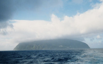 ■三宅島側から望む御蔵島。黒潮の中に浮かんでいます。周りはすべて断崖絶壁。まさに孤島の風格です。巨木も多く水豊かな自然あふれる島。真ん中より右に白く見えるのが唯一の集落。「里」と呼ばれています。 | |