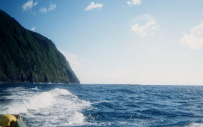 ■ウオッチング船はこんな感じで島を周りながらイルカを探していきます。イルカを見つけたところで船をとめて、海面 にエントリー。周りの絶壁のところどころから滝が直接海面に流れ込んでいます。島の養分が海に流れ、プランクトンが発生し、魚が豊富になり、イルカが棲みついています。 | |