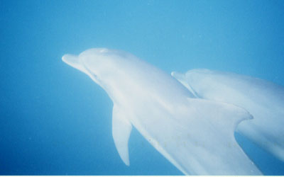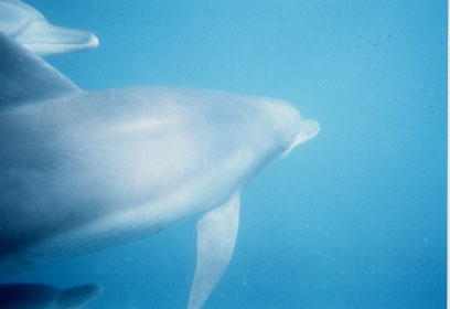 ■1日目もイルカと泳げたのですが、とても素早すぎて写 真はあきらめました。2日目の2番目にエントリーしたところでは3匹のイルカが15分以上遊んでくれたのでそこで写 真を撮ることができました。初めて水中 写ルンですで撮った写真です。御蔵島に行ったときは丁度台風が過ぎ去った直後でしたので、海中はかなり濁っていて、透明度はあまり高くありませんでした。見通 しがきかず、イルカは突然目の前に現れてきます。 | |