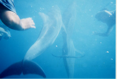 ■人は15人ほどいるのですがその間をスルリとイルカが泳ぎ抜けていきます。すぐ目の前を泳ぎ抜けていくこともあって、目も合ってしまいます。 |