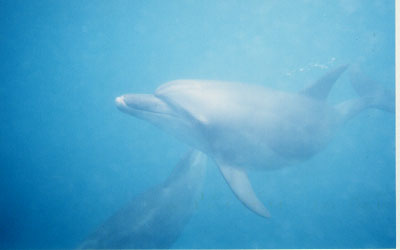 ■海中は静かな訳ではなく、多分イルカが遊んでくれてるときだと思いますが、イルカのピーッピーッと鳴く凄い高い音が海中に鳴り響いています。うるさいわけではなくてとても心地良い音です。この写 真では濁っている中でかすかに海底の岩の様子も見えます。海底の深さは15Mくらいでしょうか。 | |