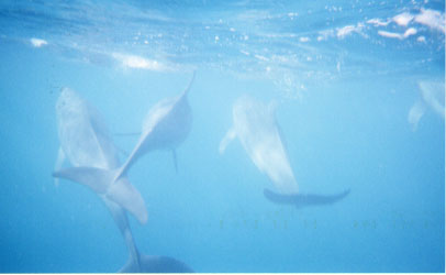 ■その後別のポイントでエントリーした写 真。海面に入っていると7,8頭の集団がやってきてスーッと通り過ぎて行くところです。この後海底にあっという間に潜って消えていきました。 |